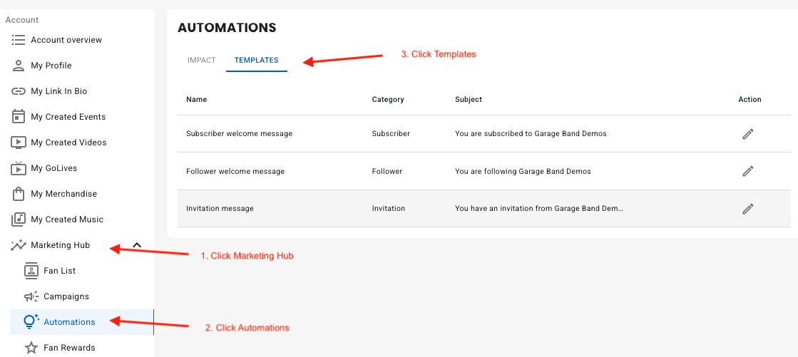 To Navigate to the automations, click on Marketing Hub in your artist Dashboard