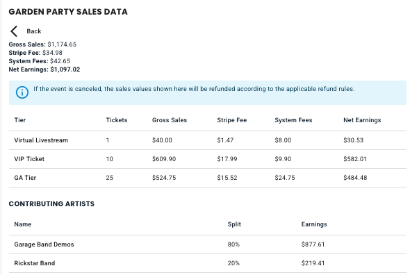 The detailed event sales data breaks down all gross sales, Stripe and System fees, and how things are broken down by artist.