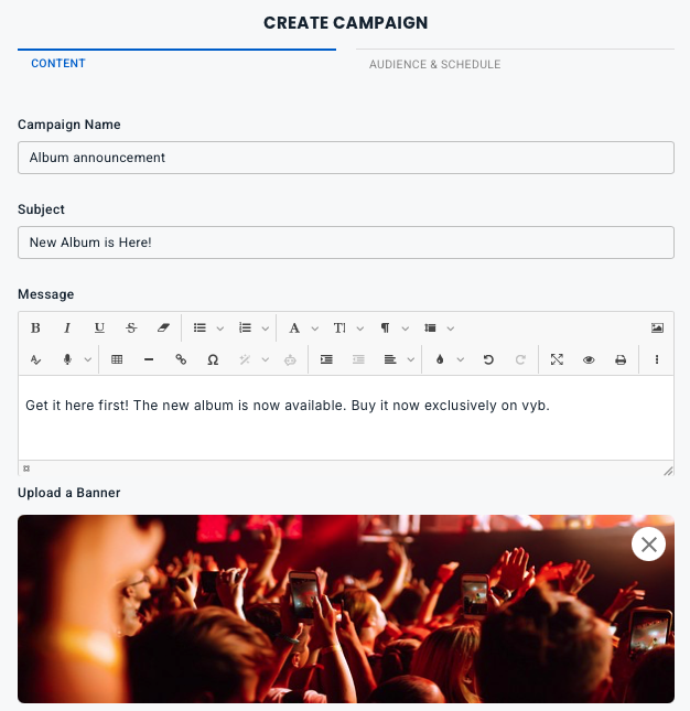 At vyb, we make it easy for you to send out an email blast to your fans. Below are the steps to make that happen.