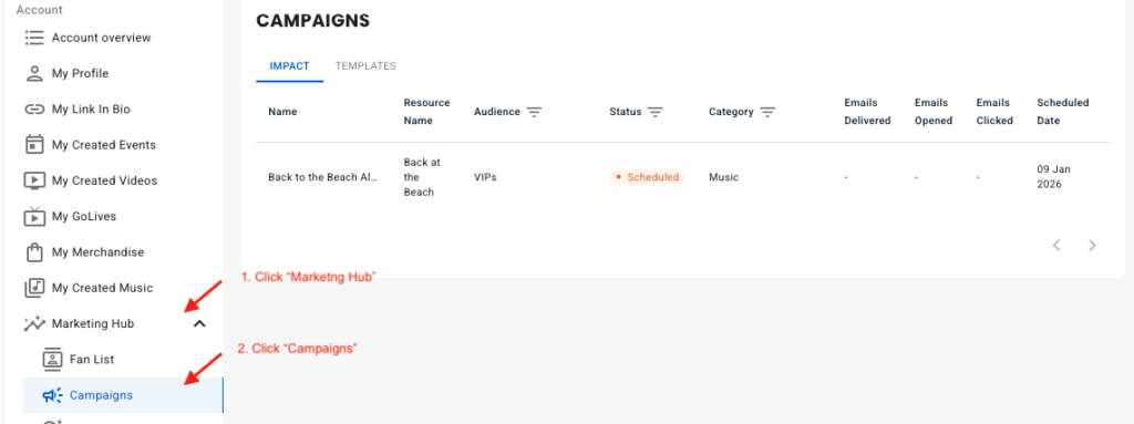 To monitor your campaign, open “Campaigns” under the Marketing Hub.