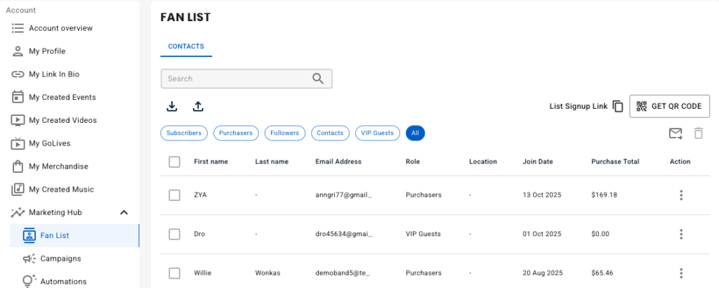 In your Marketing Hub, you’ll find your Fan List. You can search and sort this list.