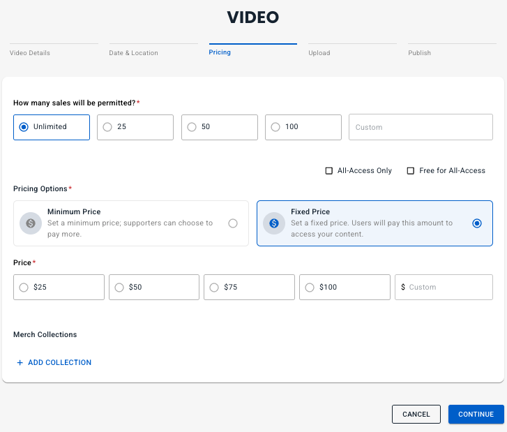 Set the pricing option. Free is only allowed for All-Access. Minimum Price option lets your fans pay more, like a built in tip.