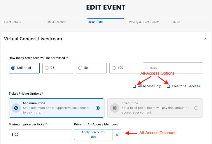 If the event is not free for All-Access members, you can set an All-Access discount.