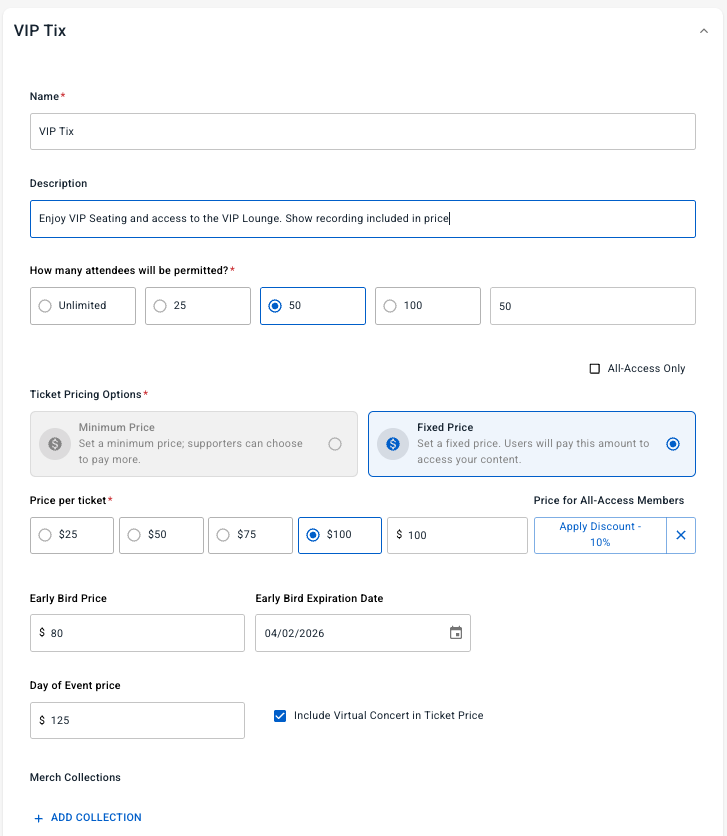 You can add exclusive merch that is only available to fans that buy a ticket. Each tier can have it’s own set of merch available.