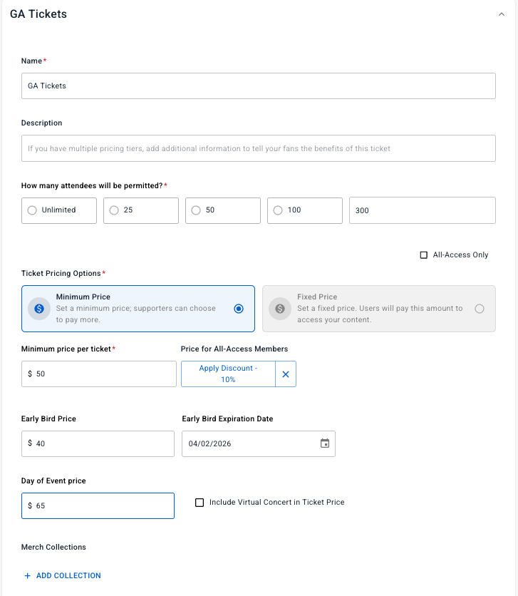 Pricing: Either select Fixed Price or Minimum Price. With the Minimum Price option, you set the minimum amount that fans will pay for a ticket. Industry data shows that most people pay a little extra, which is like a built-in tip.