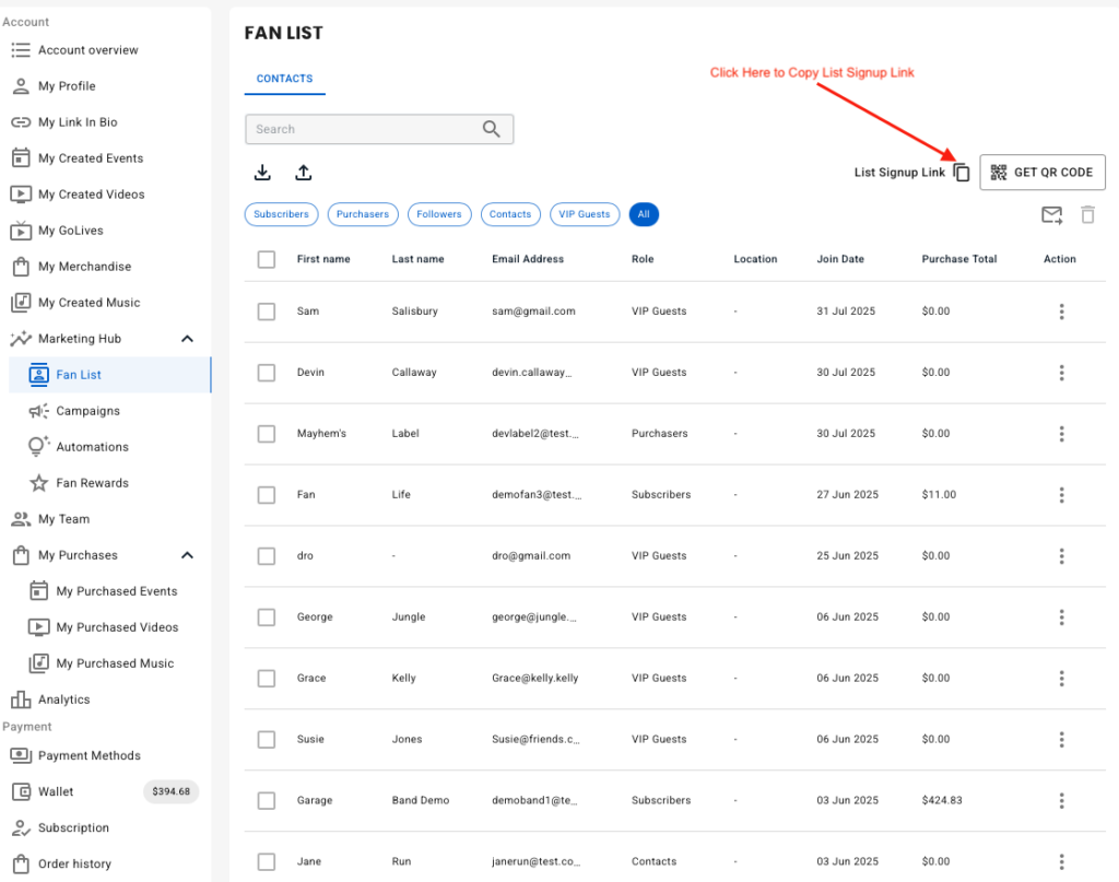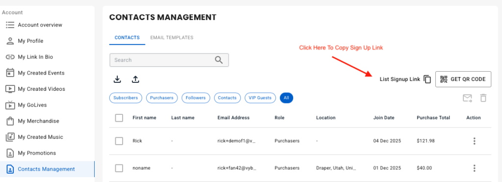 If you have your own link in bio tool that you already like, simply navigate to Contacts Management in your artist dashboard and you can copy the list signup link.