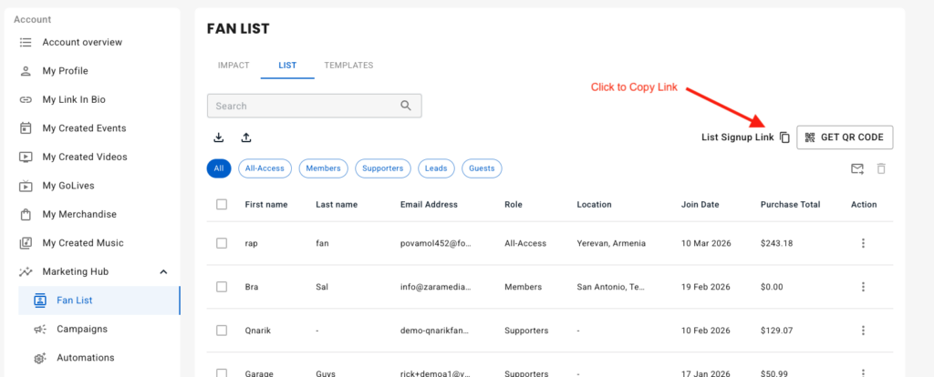 If you have your own link in bio tool that you already like, simply navigate to Fan List in your artist dashboard under the Marketing Hub and you can copy the list signup link.
