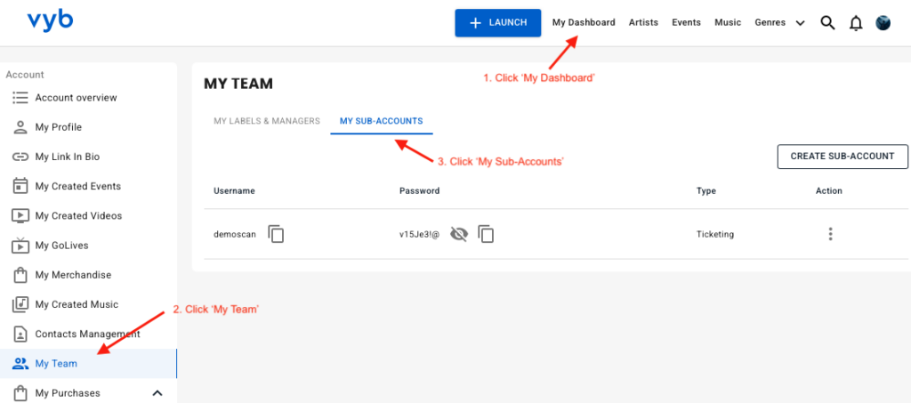 Navigate to sub-accounts by clicking My Dashboard, My Team, My Sub-Accounts