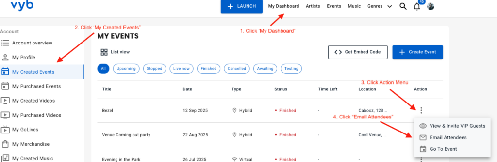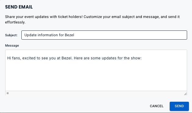 In vyb we make it simple to send email notifications to all ticket holders from your event. Maybe you need to tell of a time change, parking instructions, a line-up change, or just simply want to tell all your fans you are excited to see them at the event.