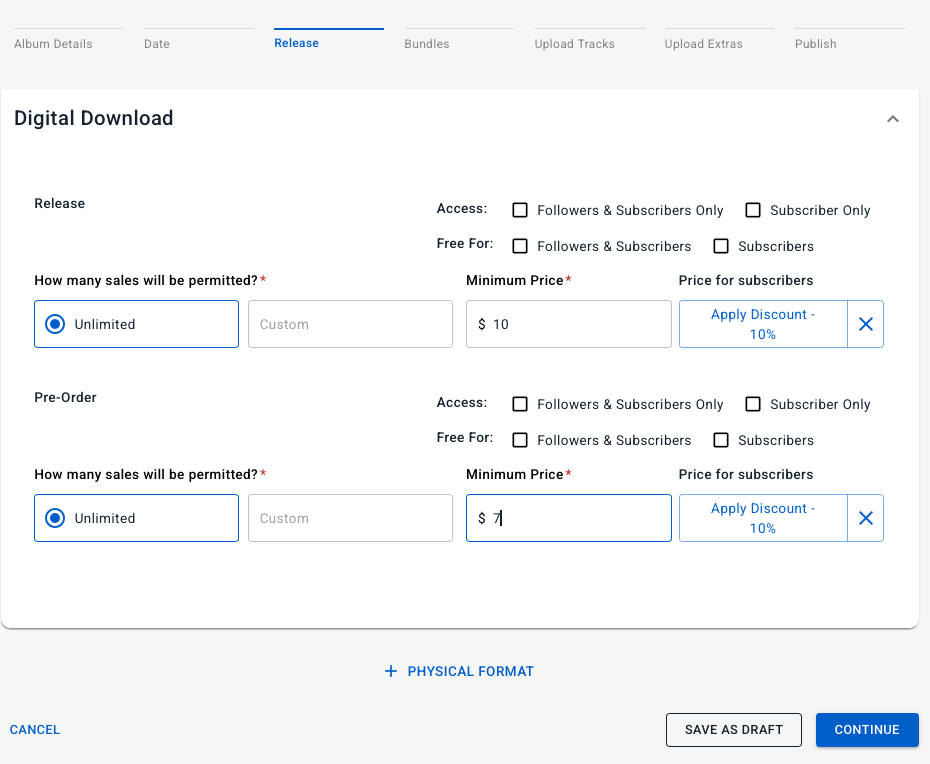 Set pricing on the release and the pre-order just as you did on the Digital Download.