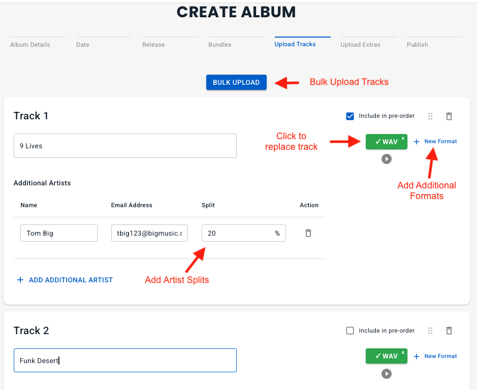 The easiest way to upload all your tracks is to use the bulk upload button. You can bulk upload all tracks at once, in multiple formats. Or you can upload a group of tracks at a time.