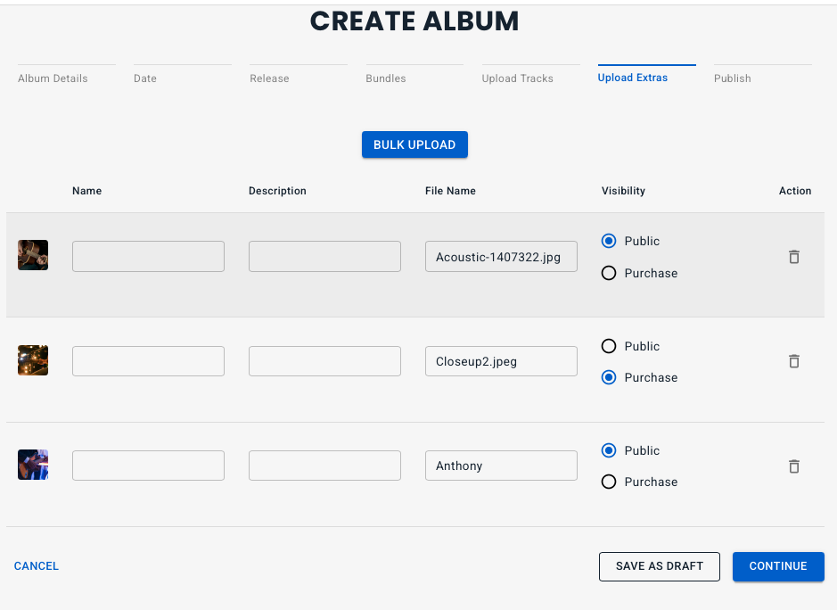 These files can either be ‘Public’, which makes them browsable by those shopping your music, or ‘Purchase’, which makes them only available to those who purchase your music. Your choice!