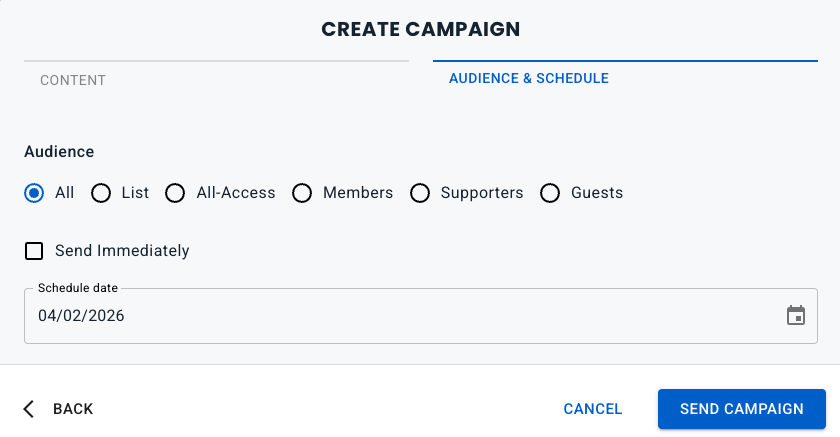 Finally, set the scheduled date for your campaign email to begin and press SEND! You are done